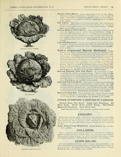| Keywords: Vick's garden and floral guide (16377331637).jpg VEGETABLE SEEDS 89 <br> IMPROVED AMERICAN SAVOY <br> Warren's Stone Mason A great improvement on the old Stone Mason <br> The heads are deep and nearly round An excellent sort to carry through the <br> winter Its reliability for heading is unsurpassed Comes in with the Fottler's <br> and is a capital sort to succeed the All Seasons Pound 2 25; oz 20 cents; <br> y+ oz 5 cents <br> The Lupton This variety is one of the best for a mam crop combining as it <br> does the best qualities of the second early and the late sorts It is also one of <br> the best keepers we have coming out in the spring bright and fresh Pound <br> 2 00 ; oz 20 cents ; oz 5 cents <br> Autumn King or World Beater A new strain of late Cabbage and one <br> which will supersede the old reliable Mammoth Marblehead Cabbage of <br> years ago The Autumn King grows to an enormous size making heads as <br> solid as a rock and comes uniformly true to type It can be relied upon to pro- <br> duce a greater weight of crop from same space of ground than most of the late <br> sorts producing but few outer leaves Pound 2 25; oz 20 cents; oz <br> 5 cents <br> Louisville Drumhead A variety grown largely by market gardeners in the <br> Southwest It stands hot weather better than most other sorts and is a sure <br> cropper Resembles Premium Flat Dutch Pound 1 75; oz 20 cents; <br> oz 5 cents <br> Vick's Improved Danish Ballhead Hardest <br> heading variety known Remarkable for great weight and long-keeping quali- <br> ties The fame of this particular strain has become world-wide and it stands <br> without a peer Introduced by us asa novelty in 1887 and has increased infavor <br> among shippers and growers until now it is difficult to supply the demand It <br> commands a higher price in the market than any other variety Heads of medium <br> size with few outer leaves admitting of close planting ; exceedingly fine <br> hardest of all tender crisp solid with no waste heart Will average six pounds <br> per head Do not be deceived by substitutes such as German Export Hol- <br> lander and other named sorts There is only one Improved Danish Billhead <br> Cabbage and this we import direct from our original grower in Denmark <br> Pound 2 50 ; oz 25 cents ; oz 10 cents ; packet 5 cents <br> Selected Premium Late Flat Dutch No introduction is neces- <br> sary for this old reliable and popular Cabbage There are many so-called <br> strains of this valuable variety but what we offer is our own having for years <br> taken great pains to maintain and develop all its good qualities It produces <br> large solid heads of superior quality keeping in best condition for a long <br> time Pound 1 50 ; oz 15 cents ; oz 5 cents <br> Improved American Savoy This variety is decidedly the peer of all Savoy <br> Cabbages either lor market or kitchen garden ; a reliable header The heads <br> are large and possess a fine delicate flavor showing beautiful curled and crim- <br> pled leaves of a dark rich green color They are large and very solid We can <br> recommend this variety to all those market gardeners who grow Savoys by the <br> acre for general market Pound 1 75 ; oz 20 cents ; oz 5 cents <br> Mammoth Rock Red This is by far the best largest and most reliable <br> heading red Cabbage ever introduced The head is large round very solid <br> and of a deep red color Pound 2 50; oz 20 cents ; oz 5 cents <br> OTHER STANDARD VARIETIES OF CABBAGE <br> Newark Early Flat Dutch Large Late Drumhead All <br> Head Early Dwarf Green Curled Savoy Marblehead <br> Mammoth Drumhead Early Blood Red <br> Each 1 50 per pound ; ounce 15 cents ; quarter ounce 5 cents <br> CHICORY <br> Sow Chicory seed in the spring in drills half an inch deep and in good mellow <br> soil The after culture is the same as for Carrots In the autumn the plants will be <br> ready for blanching when it is used as a salad The dried and prepared roots of <br> this variety are also used quite extensively as a substitute for and an adulterant <br> of coffee <br> Large Rooted Long Magdeburg Pound 80 cents ; oz 10 cents ; <br> oz 5 cents <br> COLLARDS <br> This is a variety of Cabbage largely grown in the South where it is extensively <br> used for both man and beast It forms a large loose open head or mass of leaves <br> Freezing does not injure the crop Sow seed in the South from January to May <br> and August to September Pound 1 00 ; oz 10 cents ; l / 2 oz 5 cents <br> CORN SALAD <br> A favorite salad plant in Europe Sown in August and protected with a few <br> leaves during winter it can be gathered very early in spring Sown in April it is <br> soon fit for use The leaves are sometimes boiled and served as Spinach <br> Pound 60 cents ; oz 10 cents ; l / 2 oz 5 cents 43864443 149533 78224 Page 89 Text http //www biodiversitylibrary org/page/43864443 1900 10 5962/bhl title 78224 Henry G Gilbert Nursery and Seed Trade Catalog Collection ; James Vick's Sons Rochester N Y Biodiversity Heritage Library Vick's garden and floral guide 1900 Garden Stories Catalogs Commerce Equipment and supplies Flowers Gardening James Vick's Sons Rochester N Y Rochester N Y Seeds Vegetables U S Department of Agriculture National Agricultural Library bhl page 43864443 dc identifier http //biodiversitylibrary org/page/43864443 James Vicks Sons bhlGardenStories lettuce BHLinbloom james vick's sons rochester n y rochester n y u s department of agriculture national agricultural library james vicks sons bhlgardenstories bhlinbloom Information field Flickr posted date ISOdate 2015-02-17 CC-BY-2 0 BioDivLibrary https //flickr com/photos/61021753 N02/16377331637 2015-08-24 22 53 00 cc-by-2 0 PD-old-70-1923 lettuce Vick's garden and floral guide Photos uploaded from Flickr by Fæ using a script |