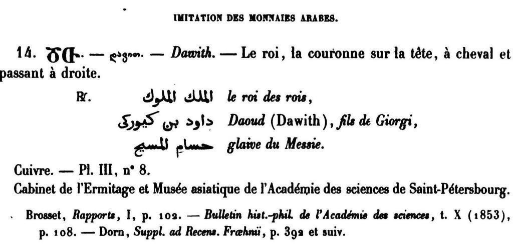 Keywords: Victor Langlois.Dawith.Le roi des rois Daoud, fils de Giorgi, glaive du Meisse 45.jpg fr Victor Langlois Dawith Le roi des rois Daoud fils de Giorgi glaive du Meisse 45 http //books google com/books id puYWAAAAYAAJ pg RA1-PA45 v onepage q f false Victor Langlois Numismatique de la Géorgie au Moyen âge P 45 1852 Victor Langlois 1829-1869 Numismatique de la Géorgie au Moyen âge Victor Langlois Source http //books google com/books id puYWAAAAYAAJ Numismatique de la Géorgie au Moyen âge by Victor Langlois PD-old Scans from Google Books |