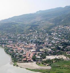 Keywords: View of Svetitskhoveli from Jvari.jpg en View of the Svetitskhoveli cathedral and the adjoining neighborhoods of Mtskheta as seen from the Jvari monastery own 2010-08-01 Kober Commonist Cityscapes of Mtskheta Svetitskhoveli