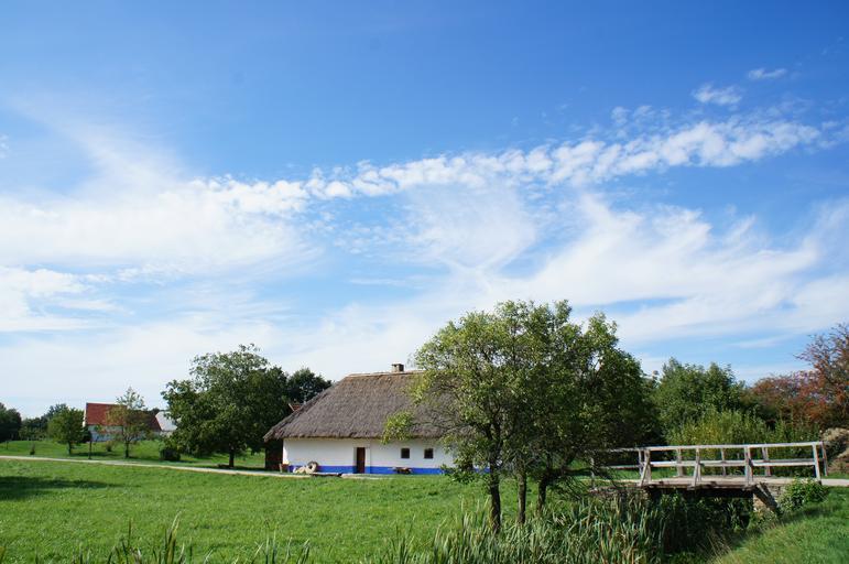Keywords: village the countryside blue sky clouds green white house of commons little bridge meadow