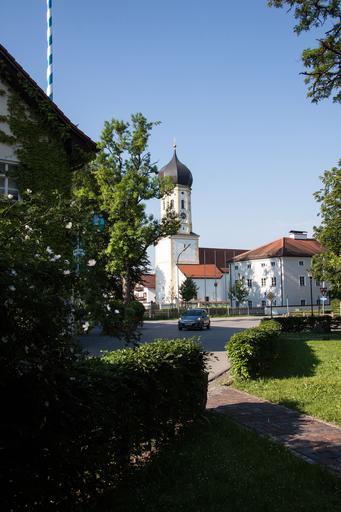 Keywords: village local transit church onion dome baroque upper bavaria rural maypole spring tradition blue white trees morning light early in the morning auto lüftlmalerei shield caption inn hotel wine partner hedge heck roses