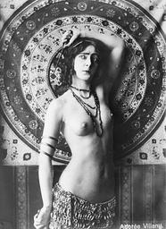 Keywords: VillanyCircleBackgroundElbowUpBain.jpg Dancer Adorée Villany half-length photoportrait standing in front of circular design print topless with necklace elbow above her head Bain News service photo via Library of Congress site http //hdl loc gov/loc pnp/ggbain 12379 Not dated Probably 1910s Unnamed photographer for Bain News Service PD-Bain Adorée Villany Vintage nude photographs Topless women with necklaces in cleavage Nude or partially nude women facing right and looking left Black and white photographs of topless women |