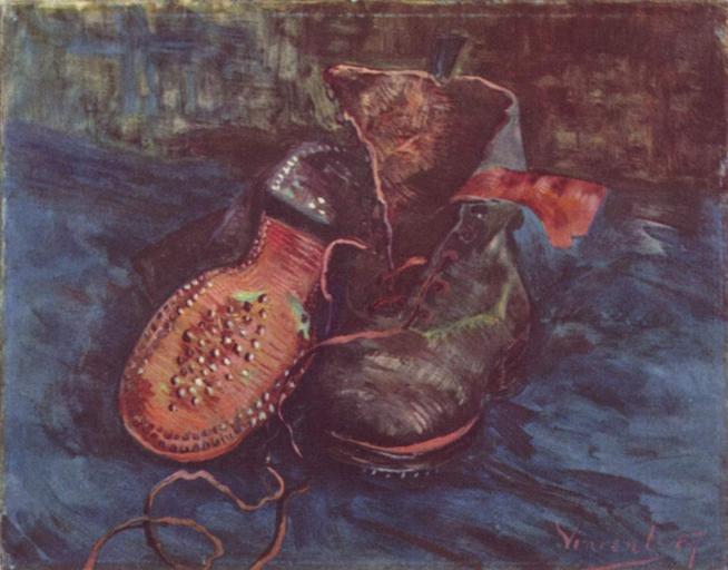 Keywords: Vincent Willem van Gogh 117.jpg Artwork Creator Vincent van Gogh Paris early 1887 oil canvas cm 34 41 5 Institution Baltimore Museum of Art accession number 1950 302 http //www artbma org/educators/atg/pdf/atg_12-07 pdf The Baltimore Museum of Art<br/>http //www vangoghgallery com/catalog/Painting/379/Pair 20of 20Shoes 20A html vangoghgallery com object history credit line The Cone Collection formed by Dr Claribel Cone and Miss Etta Cone of Baltimore Maryland exhibition history Vincent 87 ~ lower right signature and date Van Gogh catalogues 333 1236 Yorck http //mail wikipedia org/pipermail/wikide-l/2005-April/012195 html PD-old-100 PD-Art-YorckProject DEFAULTSORT Van Gogh 1887 A pair of shoes Baltimore Museum of Art A pair of shoes by Vincent van Gogh Paris 1887 |