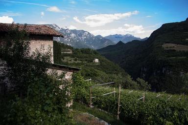 Keywords: vineyard winegrowing stone house mountains abendstimmung sky clouds green shadow trentino trentin
