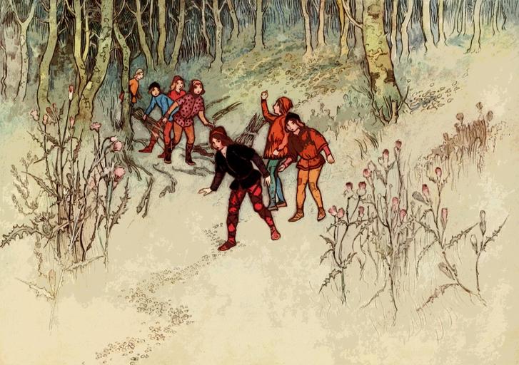 Keywords: vintage old antique charming enchanted retro illustrated warwick goble illustrator fairy tale story book illustration art people kids children forest woods trees nature outdoors landscape