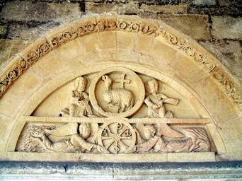 Keywords: Vitoria - Armentia, Basilica de San Prudencio 08.jpg en Tímpano románico del siglo XII con el Cordero místico y el Crismón empotrado en el pórtico de la Basílica de San Prudencio de Armentia en Vitoria-Gasteiz Álava País Vasco España Own Zarateman 2009-05-24 Chi Rho in Spain Church reliefs in Álava-Araba Basilica of San Prudencio de Armentia Romanesque tympanums in Spain Reliefs of the Agnus Dei |