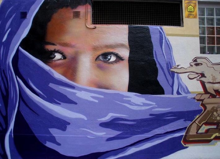 Keywords: vitoria-gasteiz spain art artistic painting graffiti face macro close-up artistry wall building structure outside woman female scarf