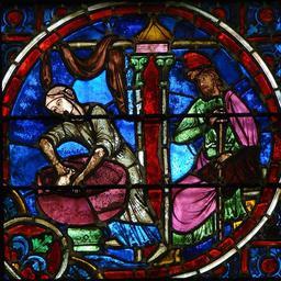 Keywords: Vitrail Choeur Laon 260808 6.jpg fr Vitrail de la cathédrale Notre-Dame de Laon verrière droite du choeur les préfigures de la Vierge et la vie de la Vierge 1er quart du 13ème siècle restaurée après l'explosion de 1870 La naissance de la Vierge médaillon de droite une servante et Joachim own Vassil 2008-09-13 IM02000151 Right east stained-glass window in Laon cathedral |