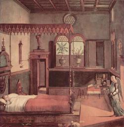 Keywords: Vittore Carpaccio 050.jpg Artwork de Gemäldezyklus zur Legende der Hl Ursula Szene Der Traum der Heiligen Oil Canvas cm 274 267 de Venedig de Gallerie dell'Accademia de Gemäldekomplex bestehend aus 9 Werken Auftraggeber Scuola di Sant' Orsola in Venedig The Yorck Project 10 000 Meisterwerke der Malerei DVD-ROM 2002 ISBN 3936122202 Distributed by DIRECTMEDIA Publishing GmbH 1495 Creator Vittore Carpaccio http //mail wikipedia org/pipermail/wikide-l/2005-April/012195 html Other versions PD-old-100 PD-Art-YorckProject Dream of Saint Ursula by Carpaccio |