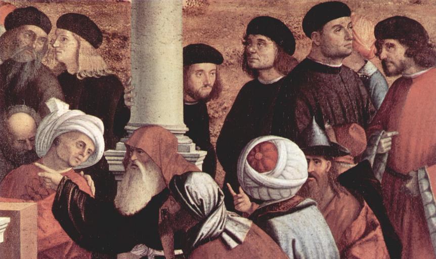 Keywords: Vittore Carpaccio 062.jpg Artwork de Gemäldezyklus zur Legende des Hl Stephan Szene Streitgespräch des Hl Stephan Detail oil canvas de Mailand de Pinacoteca di Brera de Urspr Gemäldezyklus für eine venezianische Scuola The Yorck Project 10 000 Meisterwerke der Malerei DVD-ROM 2002 ISBN 3936122202 Distributed by DIRECTMEDIA Publishing GmbH 1514 Creator Vittore Carpaccio http //mail wikipedia org/pipermail/wikide-l/2005-April/012195 html Other versions PD-old-100 PD-Art-YorckProject Hats in art Disputation of Saint Stephen by Carpaccio |