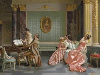 Keywords: Vittorio Reggianini - The Recital.jpg Artwork Creator Vittorio Reggianini painting of early 19th century scene -- the women are amusing themselves at the expense of the man playing piano and singing the woman turning pages hides her laughter behind a fan oil on canvas cm 77 101 5 object history exhibition history credit line signed bottom right VReggianini accession number http //www christies com/lotfinder/paintings/vittorio-reggianini-the-recital-5549957-details aspx Christie's Vittorio Reggianini PD-old-auto-1923 1938 Regency revival genre paintings |