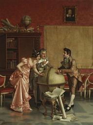 Keywords: Vittorio Reggianini - The Way of the World.jpg Artwork Creator Vittorio Reggianini painting of early 19th century scene -- two men and a woman following world news with an atlas and large globe oil on canvas cm 74 9 50 8 object history exhibition history credit line signed bottom left V Reggianini accession number http //www bonhams com/auctions/17523/lot/70/ Bonhams Vittorio Reggianini People with globes in art PD-old-auto-1923 1938 Regency revival genre paintings |