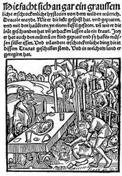 | Keywords: Vlad Tepes - Blatt 3.jpg Woodcut from the title page of a 1499 pamphlet published by Markus Ayrer in Nuremberg It depicts Vlad III the Impaler identified as Dracole wyade Draculea voivode dining among the impaled corpses of his victims Original caption Hie facht sich an ein graussemliche erschrockenliche hystorien von dem wilden wütrich Dracole wayde Wie er die leut gespist hat und gepraten und mit den haubtern in in einem kessel gesoten und wie er die leut geschunden hat und zerhacken lassen als ein kraut Item er hat auch den mütern ire kind gepraten und sy haben müssen selber essen Und vil andere erschrockenliche ding die in dissem Tractat geschriben stend Und in welchem land er geregiret hat 1499 Markus Ayrer PD-old File Impaled gif PD-old-100 Vlad III the Impaler in engravings Impalement Woodcuts of Germany Massacres in Romania Massacres in art |