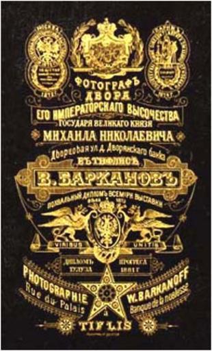 Keywords: Vladimir Barkanov's photographic stamp. Tiflis. 1880.jpg en Vladimir Barkanov's photographic stamp Tiflis 1880 ka ვლადიმერ ბარკა ვის ფ ტ სტუდიის შტამპი ტფილისი 1880 წ http //www photomuseum org ge/photographers/barkanov/01 jpg photomuseum org ge Creator Vladimir Barkanov 1880 Source http //www photomuseum org ge/photographers/barkanov/barkanov_en htm www photomuseum org ge en <br> http //www photomuseum org ge/photographers/barkanov/barkanov_ge htm www photomuseum org ge ge PD-old-100 Photographic stamps in Georgia 1880 in Tbilisi Photos by Vladimir Barkanov |