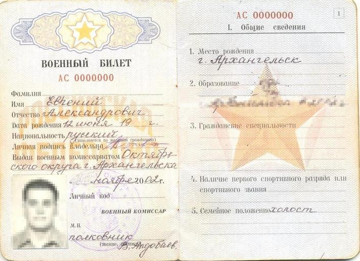 | Keywords: Voen-Bilet RF.jpg Главный азво от военного билета выданного в 2002 году Transferred from http //ru wikipedia org ru wikipedia; transferred to Commons by User Pauk using http //tools wikimedia de/~magnus/commonshelper php CommonsHelper <br/> Original text Скане 14 янва я 2008<br/> 2008 01 14 original upload date СССР Original uploader was Fnaq at http //ru wikipedia org ru wikipedia PD-RU-EXEMPT; Released into the public domain by the author PD-RU-exempt documents ru wikipedia Fnaq Original upload log page ru wikipedia Voen-Bilet_RF jpg 2008-01-14 20 00 Fnaq 1313954 478266 bytes <nowiki> Описание Главный азво от паспо та г ажданина России Авто В емя создания 14 янва я 2008 Источник Скане </nowiki> Conscription Military identity cards of Russia |