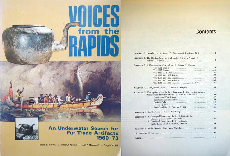 Keywords: Voices of Rapids, by Wheeler, Kenyon, Woolworth, Birk, 1975.jpg Robert C Wheeler Walter A Kenyon Alan R Woolworth Douglas A Birk Voices from the Rapids An Underwater Search for Fur Trade Artifacts 1960-73 Part of cover is pixelized for copyright reasons Russel w Fridley Director June Drenning Holmquist Assistant Director for Research and Publications Publication of the Historical Society Minnesota Historical Archeology series No 3 St Paul ISBN 0-87351-086-0 On the cover The small teakattle pictured was recovered in the early 1960s by Dr E W Davis and divers Donald Franklin and Curtis Anderson from a small rapids between Gunflint and Little Guntflint lakes It is very similar to one portrayed by artist Frances Ann Hopkins 1838-1918 in her view of a North canoe passing along high rocky cliffs Mrs Hopkins often accompanied her husband secretary to the governor of the Hudson's Bay Company on such canoe journeys through the North American wilderness which she then depicted with beauty and accuracy The teacattle is owned by the Minnessota Historical Society; the painting is reproduced with permission of the Public Archives of Canada Ottawa Collection G C Franke 1975 Robert C Wheeler Walter A Kenyon Alan R Woolworth Douglas A Birk PD-text PD-old Collection G C Franke Furs in 1975 Fur traders Furs literature English Wheeler 1975 books from the United States Book covers from the United States |