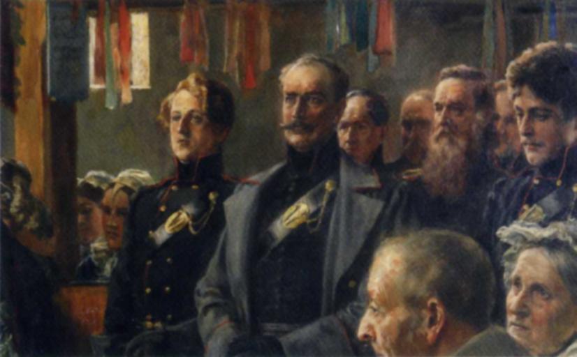 | Keywords: Vor dem Auszug der Lützower Jäger - Detail.jpg en Before the Departure of the Lützower Jäger - Detail By Rudolf Eichstädt ca 1907-08 121 x 180 cm oil on canvas Privately owned Among the figures portrayed are Adolf von Lützow in the gray military coat Friedrich Friesen the cofounder of German gymnastics fraternity brother and educator to the left of Lützow Friedrich Ludwig Jahn the Father of Gymnastics to the right of Lützow and Theodor Körner The painting is reminiscent of the benediction of the Lützow Volunteers in the Lutheran church in the village of Rogau on March 27 1813 de Vor dem Auszug der Lützower Jäger Rudolf Eichstädt um 1907/08 121 x 180 cm Öl auf Leinwand Privatbesitz Abgebildet sind Adolf von Lützow im grauen Militärmantel Friedrich Friesen der Mitbegründer der deutschen Turnkunst Burschenschaftler und Pädagoge links neben Lützow Turnvater Jahn rechts neben Lützow und Theodor Körner Das Gemälde bezieht sich auf die Einsegnung des Lützowschen Korps in der lutherischen Dorfkirche zu Rogau vom 27 März 1813 Für die Freiheit - gegen Napoleon Ferdinand von Schill Preußen und die deutsche Nation ed by Veit Veltzke Cologne 2009 p 94 artwork Rudolf Eichstädt; file James Steakley artwork 1907; file 2009-10-14 thumb left 300px Members of the Lützow Free Corps Ludwig Adolf Wilhelm von Lützow Friedrich Ludwig Jahn Friedrich Friesen Paintings of Theodor Körner Rudolf Eichstaedt PD-Art |