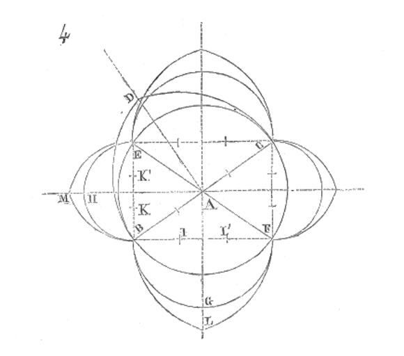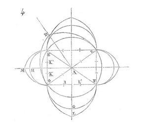 Keywords: Voutes.sur.plan.carre.png Prenons d'abord une des voûtes des bas-côtés de ce porche voûtes établies sur plan carré 3 La forme génératrice de cette voûte est un hémisphère La preuve c'est que les deux plans verticaux passant par les diagonales <i>ab</i> <i>cd</i> donnent deux demi-cercles dont l'un est rabattu en <i>abd</i> Pour tracer les arcs doubleaux au-dessus de l'arrase formée par les tailloirs A des chapiteaux on a pris une distance AB pour bien dégager la naissance de ces arcs La ligne de niveau BC étant tracée la longueur de cette ligne étant <i>db</i> côté du carré cette ligne a été divisée en quatre parties; élevant une perpendiculaire sur le milieu de la ligne de naissance cette perpendiculaire a été divisée en deux parties et demie égales à chacune des divisions de la ligne de naissance On a ainsi tracé le triangle <i>ghf</i> Du milieu de chacun des côtés de ce triangle élevant une perpendiculaire <i>ei</i> les points de rencontre <i>i</i> de ces perpendiculaires avec la ligne <i>gh</i> ont donné les centres de l'arc brisé <i>gfh</i> Réunissant le sommet <i>d'</i> de la voûte avec les sommets des quatre arcs la voûte d'arête engendrée par une coupole hémisphérique et par quatre ogives a été construite Viollet-le-Duc Drawings by Eugène Viollet-le-Duc |