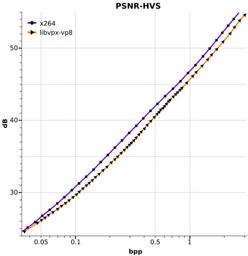 Keywords: VP8 vs. H.264 PSNR-HVS.svg en plot of PSNR-HVS score over bits per pixel shows that libvpx version presumably from 2014 with VP8 format needs ~20 more bitrate than x264 version presumably from 2015 H 264 format for equal quality according to the objective quality metric PSNR-HVS 2015-03-26 https //arewecompressedyet com/ r 5B 5D vp8 s video-1-short Flugaal other versions cc-zero TrueMotion VPx H 264/MPEG-4 AVC SVG line charts |