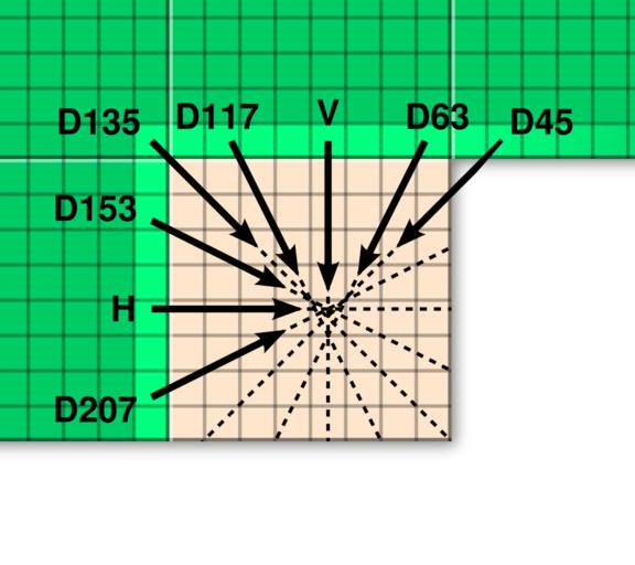 Keywords: VP9 intra modes.svg en Intra prediction modes in VP9 Apart from using a single average value DC predictor or a kind of planar prediction true-motion predictor VP9 allows coding samples of a new image block <span style color ffc791; font-weight 600; >pink</span> using the closest <span style color 00ff7e; font-weight 600; >bright green</span> of the samples of already coded blocks <span style color 00cc66; font-weight 600; >green</span> from a given direction <span style color 000000; font-weight 600; >black arrows</span> one per prediction block as estimate for delta coding directional intra prediction modes de Intra-Vorhersagemodi bei VP9 Neben einem einzelnen Mittelwert DC-Prädiktor und einer Art planarer Vorhersage žtrue-motion -Prädiktor können für die Kodierung der Abtastwerte eines neuen Bildblockes <span style color ffc791; font-weight 600; >rosa</span> die jeweils in einer bestimmten für den gesamten Vorhersageblock gültigen Richtung <span style color 000000; font-weight 600; >schwarze Pfeile</span> nächstgelegenen Abtastwerte <span style color 00ff7e; font-weight 600; >hellgrün</span> eines bereits kodierten angrenzenden Blockes <span style color 00cc66; font-weight 600; >grün</span> als Schätzwert zur Differenzkodierung herangezogen werden gerichtete Intra-Vorhersagemodi 2016-09 own Flugaal other versions cc-zero VP9 Technical diagrams