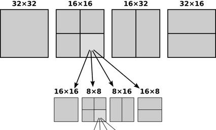 Keywords: VP9 superblock partitioning.svg en Partitioning possibilities of the 64×64 pixel superblocks coding unit in VP9 Only square subblocks can be recursively subdivided further down to the size of 4×4 pixels Unterteilungsmöglichkeiten der 64×64-Bildpunkte-Superblöcke Kodierungseinheiten bei VP9 Quadratische Blöcke können rekursiv weiter unterteilt werden bis hinunter zu 4×4 Bildpunkte großen Blöcken 2016-09 own Flugaal other versions File H 264 block division svg File VP9 example superblock partitioning svg cc-zero VP9 Technical diagrams |