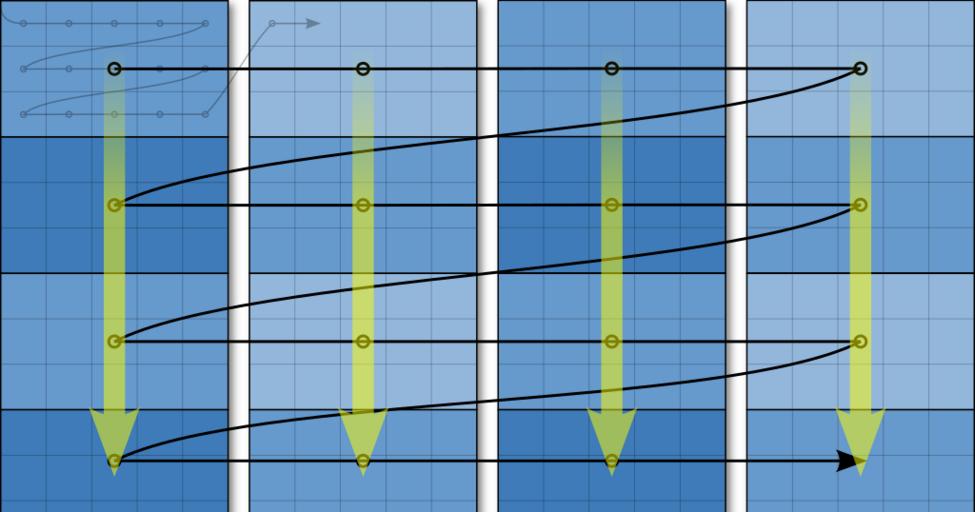Keywords: VP9 tiles 720p.svg vertex markers e g arrow ends don't adhere to the transparency setting of the referencing line elements en Example of VP9 tile structure for a 720p video frame In VP9 frames can be split along superblock boundaries into a set of 2<sup>x</sup> evenly spaced tiles <span style color 6699cc; >blue</span> with tile columns coded independently indicated by the gaps to allow parallel processing with multiple CPU cores for example <span style color d6e673; >Yellow</span> arrows show how in this example up to 4 individual processing threads can work independently through the data of the individual tile columns of the frame Black arrows show the coding order i e how things are ordered in the bitstream de Beispiel einer VP9-Kachelstruktur bei einem 720p-Videoeinzelbild In VP9 können Einzelbilder entlang Superblockgrenzen in einen Satz von 2<sup>x</sup> gleichmäßig verteilten Kacheln <span style color 6699cc; >blau</span> aufgeteilt werden wobei die Kachelspalten unabhängig kodiert werden angedeutet durch die Lücken um Parallelverarbeitung zu ermöglichen beispielsweise mit mehreren Prozessorkernen <span style color d6e673; >Gelbe</span> Pfeile zeigen wie in diesem Beispiel bis zu 4 einzelne Ausführungsstränge die Daten der einzelnen Kachelspalten des Einzelbildes nebenläufig bearbeiten können Schwarze Pfeile zeigen die Kodierungsreihenfolge also die Reihenfolge der Elemente im Bitstrom 2016-08 own Flugaal other versions cc-zero VP9 Technical diagrams |