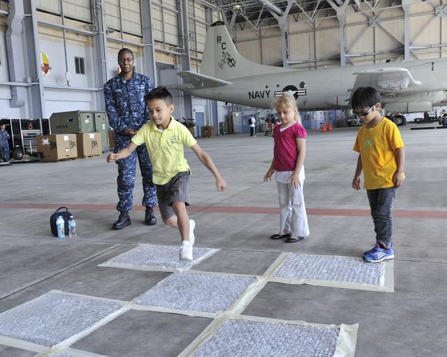Keywords: VP-46 Sailors host DoDDS school tour 140604-N-ZI955-060.jpg en Yeoman 3rd Class Kanetria Wiggins originally from Kingsland Georgia and assigned to Patrol Squadron VP 46 supervises as children take part in a bubble wrap maze at VP-46 ™s hangar June 4 2014 VP-46 Sailors hosted a visit at their facilities for first graders from Sollars Elementary School a Department of Defense Dependents School located on board Misawa Air Base VP-46 is currently deployed to Naval Air Facility Misawa in support of U S 7th Fleet operations U S Navy photo by Senior Chief Mass Communication Specialist Daniel Sanford/Released 2014-06-04 Senior Chief Petty Officer Daniel Sanford https //www dvidshub net/image/1378240 140604-N-ZI955-060 2014-06-04 04 58 MISAWA AOMORI JP PD-USGov-Military-Navy Misawa Air Base Naval Air Facility Misawa Images from DoD uploaded by Fæ