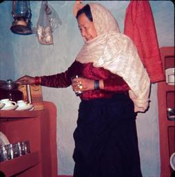 Keywords: batti commerce home life homelife kitchen tea shop teashop nepal Date: 1964-1965 Location: Tansen, Palpa Description: Woman preparing tea in her teashop along the Tansen-to-Pokhara trail. Date: 1964-1965 Location: Tansen, Palpa Description: Woman preparing tea in her teashop along the Tansen-to-Pokhara trail.