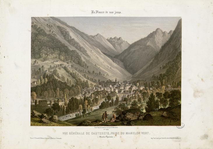Keywords: Vue générale de Cauterets, prise du Mamelon Vert (Hautes-Pyrénées) - Fonds Ancely - B315556101 A MERCEREAU 7 027.jpg Impression en 3 coul par Frick frères à Paris Fait partie d'un ensemble de recueils de lithographies de Mercereau composés de lithographies provenant de La France de nos jours vaste suite publiée par livraisons de 1853 à 1876 et comprenant 475 planches en deux tirages l'un à deux teintes noir et bistre l'autre en couleurs Les libraires ont réuni ces planches en albums de composition variable quant au nombre de planches et aux dessinateurs Asselineau Mercereau Maurice Deroy etc Un titre Les Pyrénées par Ch Mercereau; Bagnères-de-Luchon par Ch Mercereau était frappé sur le plat supérieur de la reliure de l'album ainsi que le nom du Libraire pour lequel il était réalisé La plupart des recueils de ces planches pyrénéennes portent le nom de Sajous libraire à Bagnères-de-Luchon Pl 1 à 18 numérotées de 370 à 386 Pl 374 pl 5 et 6 en double -- Pl 19 20 et 21 numérotées respectivement 407 415 et 418 Ces trois pl ont été dessinées et lithographiées par Asselineau -- Pl 22 23 et 24 numérotées 438 439 et 440 -- Pl 22 lith par Aubrun -- Pl 25 numérotée 441 -- Pl 26 à 40 numérotées de 327 à 341 -- Pl 41 à 46 numérotées de 363 à 368 -- Pl 47 numérotée 369 -- Pl 48 num 292 -- Pl 49 et 50 num 264 et 265 -- Pl 51 et 52 num 268 et 269 -- Pl 53 à 55 num de 293 à 295 -- Pl 56 num 300 -- Pl 57 à 59 num de 307 à 309 -- Pl 60 à 70 num de 316 à 326 -- Pl 71 num 63 dessin et lith d'Asselineau imprimerie Destouches -- Pl 72 et 73 num 87 et 88 dessin et lith d'Asselineau imprimerie Destouches -- Pl 74 num 124 signée Lebreton éditée chez Lalonde à Paris et imprimée chez Becquet frères à Paris -- Pl 75 num 161 dessin et litho d'Asselineau imprimerie Destouches --Pl 76 à 78 num de 207 à 209 -- Pl 79 à 81 num de 211 à 213 -- Pl 82 num 220 dessin et lith de Maurice imprimerie Destouches -- Pl 83 à 86 num de 226 à 229 -- Pl 87 et 88 num 234 et 235 -- Pl 89 à 91 num de 273 à 275 -- Pl 92 et 93 num 290 et 291 Pièces jointes 6 pl sépia dont certaines sont des doubles du recueil de Mercereau Les cinq premières planches sont numérotées respectivement 318 321 324 331 386 La dernière planche n'est pas extraite de La France de nos jours mais de L'Espagne pittoresque et monumentale Ces six planches sont signées Mercereau éditées chez Sinnet et imprimées chez Frick frères Ancely René 1876 - 1966 Possesseur fre public domain domaine public B315556101_A_MERCEREAU_7_027 jpg image/jpeg 1 f de pl lithogr ; 29 cm oblong Frick frères Imprimeur Sinnet F Éditeur http //numerique bibliotheque toulouse fr/collect/general/index/assoc//ark /74899/B315556101_A_MERCEREAU_7_027 dir/B315556101_A_MERCEREAU_7_027 jpg Bibliothèque municipale de Toulouse A-MERCEREAU 7-27 Creator Charles Mercereau http //catalogues toulouse fr/web2/tramp2 exe/do_keyword_search/log_in setting_key BMT1 servers 1home query p001651 St Jean-de-Luz intérieur de l'Eglise St Jean-de-Luz le Château de l'Infante Biarritz Vue générale prise du Phare Château de Mauvesin près Bagnères-de-Bigorre Hautes Pyrénées Bagnères de Bigorre Hautes Pyrénées - Intérieur de l'Eglise des Carmes en couleurs Bagnères de Bigorre Hautes Pyrénées - Intérieur de l'Eglise des Carmes Bagnères-de-Bigorre - Eglise et couvent des Carmes Bagnères-de-Bigorre Hautes-Pyrénées - Tour des Jacobins Cascade et Pont de Magenta Vallée de l'Esponne Hautes Pyrénées Cascade de Trémes-Aïgues Vallée de Grip Hautes Pyrénées St Sauveur Hautes Pyrénées - Le Pont Napoléon Bayonne - Eglise St André Arreau et la Vallée d'Aure Hautes Pyrénées - Vue prise au dessus de la route du Col d'Aspin Auch - Vue prise sur les bords du Gers Auch - Vue de la Cathédrale Auch - Intérieur de la Cathédrale Bagnères-de-Bigorre - Vue Générale prise de la Fontaine ferrugineuse Eaux-Bonnes Basses-Pyrénées - L'établissement Thermal et la Chapelle Nantes - Vue de l'Eglise Ste Croix Le Croisic - Plage des Baigneurs et Etablissement de Bains Le Folgoët - Vue de l'Eglise Brèche de Roland prise de Gèdres Hautes Pyrénées Eglise des Templiers à Luz Chapelle du couvent de Pouëlahun i e Pouey Lahun - Vallée d'Azun Hautes Pyrénées Le Pont de Scia - Route de Luz à Gavarnie Hautes-Pyrénées Vue de l'établissement de la Raillière près Cauterets Hautes-Pyrénées Vue du Fort de Lourdes Hautes-Pyrénées Vue d'Argelès-de-Bigorre Hautes-Pyrénées Vue de St Sauveur Hautes-Pyrénées Le Pas de l'Echelle Route de Gavarnie Hautes-Pyrénées Fond de la Vallée d'Argelès prise de la terrasse de St Savin Hautes-Pyrénées Place Grammont à Pau Basses-Pyrénées Vue générale des Eaux-Bonnes Basses-Pyrénées Barèges et la Vallée du Bastan Hautes-Pyrénées Chute supérieure du Pont d'Espagne Hautes-Pyrénées La grotte miraculeuse à Lourdes Hautes-Pyrénées Eglise de Bétharram et Pont de Lestelle Basses Pyrénées Cascade du Cerizet Près Cauterets Hautes-Pyrénées Pic du Midi d'Ossau 2885m Basses Pyrénées - Vue prise du 3e plateau de Bious-Artigues Pau - Vue prise de la terrasse du Château Toulouse - Cloître du Musée Galerie du Moyen-Age Pau - Vue du Château prise du Parc Toulouse - Cloître du Musée et Clocher des Augustins Toulouse - La maison de pierre fragment de la façade Toulouse - Intérieur de St Sernin St Jean-de-Luz Fort du Socoa Toulouse - Vue du Capitole Bordeaux Vue de la Porte du Caillau i e Cailhau Bordeaux Porte de la grosse Cloche Bordeaux Vue des Quinconces Bordeaux - Vue de la Tour et de l'Eglise de St Michel Toulouse - Vue du Pont de pierre prise du Quai de Brienne Toulouse - Abside de l'Eglise de St Sernin de l'an 1097 Toulouse - Choeur de la Cathédrale St Etienne Rouen - Hôtel de Bourgtheroulde Biarritz - Vue des Bains Napoléon et du Casino Biarritz - Vue des Bains du Port Vieux Biarritz - Vue de l'Entrée de la Ville à l'arrivée de Bayonne Le Lac Bleu Hautes-Py