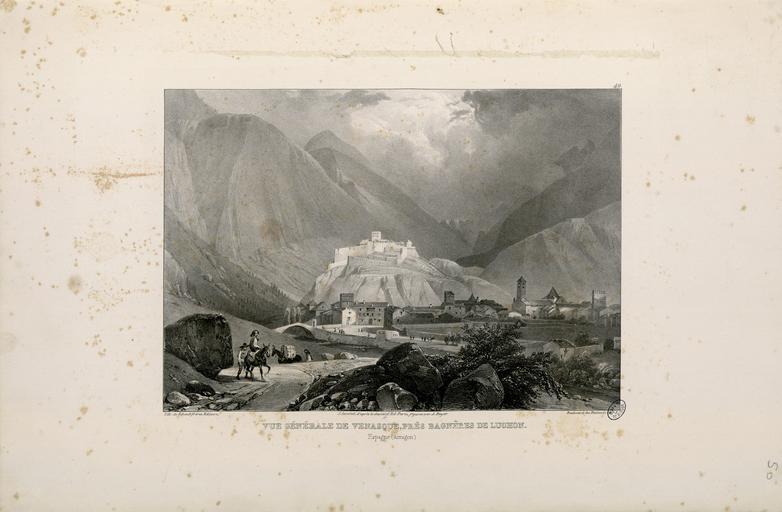 Keywords: Vue générale de Venasque, près de Bagnères de Luchon (Espagne - Arragon) - Fonds Ancely - B315556101 A JACOTTET 1 053.jpg Fait partie de la première partie d'un recueil de planches lithographiées Titre lithographié et 50 lithographies numérotées de 1 à 50 plus 4 lithographies supplémentaires numérotées de 1 à 3 ici pl 53 54 55 et une sans numéro ici pl 52 Deux planches sont numérotées 10 ce qui fait en tout un album de 55 pl L'ouvrage de Jacottet est très rare quand il est complet des deux parties Vignette lithographiée au titre Visite aux ruines de Beaucens Vallée d'Argelez Hautes Pyrénées Ancely René 1876 - 1966 Possesseur fre public domain domaine public B315556101_A_JACOTTET_1_053 jpg image/jpeg 1 f de pl lithogr ; 53 5 cm Bayot Adolphe Jean Baptiste 1810-18 Illustrateur Gihaut Jean Editeur Gihaut Michel-Ange 1800-1871 Editeur Jalon Editeur Paris Ed Illustrateur http //numerique bibliotheque toulouse fr/collect/general/index/assoc//ark /74899/B315556101_A_JACOTTET_1_053 dir/B315556101_A_JACOTTET_1_053 jpg Bibliothèque municipale de Toulouse A-JACOTTET 1-51 Creator Louis-Julien Jacottet http //catalogues toulouse fr/web2/tramp2 exe/do_keyword_search/log_in setting_key BMT1 servers 1home query p001077 vignette http //numerique bibliotheque toulouse fr/collect/general/index/assoc//ark /74899/B315556101_A_JACOTTET_1_053 dir/B315556101_A_JACOTTET_1_053_thumb jpeg between 1835 1836 Vue générale de Venasque près de Bagnères de Luchon Espagne - Arragon B315556101_A_JACOTTET_1_053 lithography - print Women in art Castles in art Ramparts Fortifications History of Pyrénées Animal-powered transport in art Province of Huesca Donkeys in art Bridges in art Towers in art Churches in art Mounds Louis-Julien Jacottet Bell towers in art Benasque Roads in art Men in art Houses in art |