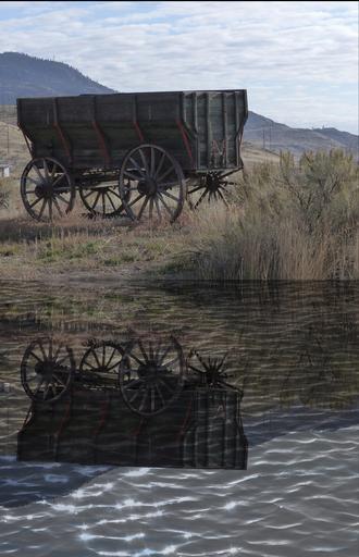 Keywords: wagon wooden wheel vintage rural antique transportation carriage transport western history wild west traditional historic aged rustic farm handmade pond reflection