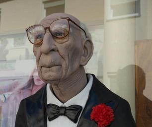 Keywords: waiter upper eat drink coffee advertising restaurant pub control plastic tray black white fly