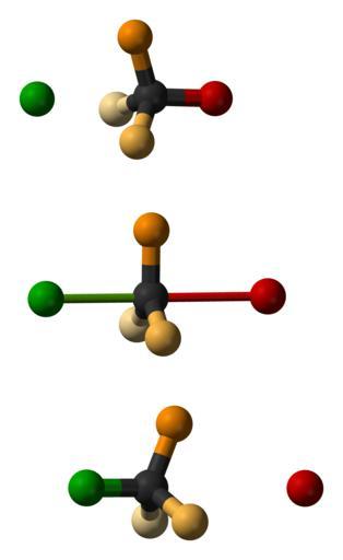 Keywords: Walden-inversion-3D-balls.png Montage using ball-and-stick models of the three steps in an S<sub>N</sub>2 reaction Colour is used to emphasise the inversion of stereochemical configuration Walden inversion that occurs at the central atom The green atom is the nucleophile the red atom is the leaving group and the three orange atoms are substituents Own 2007-12-01 Ben Mills Benjah-bmm27 Images by Ben Mills Walden inversion |