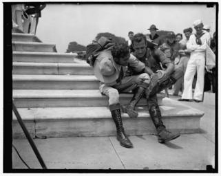 Keywords: Walk 800 miles to attend Boy Scout Jamboree 22868v.jpg Title Walk 800 miles to attend Boy Scout Jamboree Washington D C June 16 Two Venezuelan Boy Scouts Rafael Petit left and Juan Carmona right examining their boots after tramping 25 miles a day for two years in order to attend the Boy Scout Jamboree in Washington the left Caraca Januray 11 1935 arriving in Washington today Creator s Harris Ewing photographer 1937 June 16 Medium 1 negative glass 4 x 5 in or smaller accession number Reproduction Number LC-DIG-hec-22868 digital file from original negative Rights Advisory No known restrictions on publication Call Number LC-H22- D-1698-A P P institution Library of Congress Prints and Photographs Division Washington D C 20540 USA http //hdl loc gov/loc pnp/pp print Title from unverified caption data received with the Harris Ewing Collection Gift; Harris Ewing Inc 1955 General information about the Harris Ewing Collection is available at http //hdl loc gov/loc pnp/pp hec Temp note Batch four LOC-image hec 22868 http //www loc gov/pictures/search/ q Boy 20Scout 20Jamboree Harris Eweing PD-Harris-Ewing 1937 National Scout Jamboree 1937 in Washington D C Uploaded with VicuñaUploader |