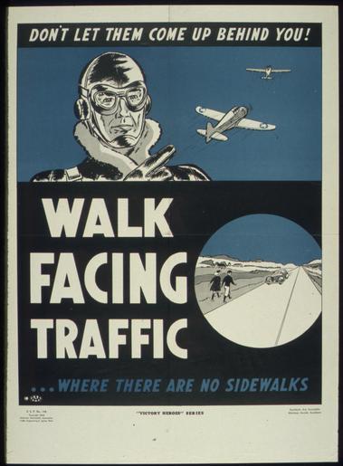 Keywords: "WALK FACING TRAFFIC, WHERE THERE ARE NO SIDEWALKS" - NARA - 516012.tif Scope and content General notes 516012 Local identifier 44-PA-2289 Office for Emergency Management Office of War Information Domestic Operations Branch Bureau of Special Services 03/09/1943 - 09/15/1945 Still Picture Records Section Special Media Archives Services Division NWCS-S National Archives at College Park 8601 Adelphi Road College Park MD 20740-6001 1941 - 1945 Record group Record Group 44 Records of the Office of Government Reports 1932 - 1947 Record group ARC 373 World War II Posters compiled 1942 - 1945 Series ARC 513498 File unit File unit ARC Variant control numbers NAIL Control Number NWDNS-44-PA-2289 yes Other versions <gallery> File WALK_FACING_TRAFFIC _WHERE_THERE_ARE_NO_SIDEWALKS _-_NARA_-_516012 tif tif File WALK_FACING_TRAFFIC _WHERE_THERE_ARE_NO_SIDEWALKS _-_NARA_-_516012 jpg jpg </gallery> NARA-cooperation PD-USGov 1940s works in the United States Pedestrians in the United States Safety posters Pedestrian safety World War II posters from the United States NARA TIF images with categorized JPGs |