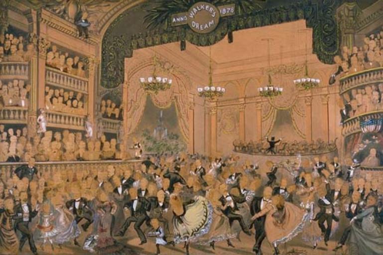 Keywords: Walkers Dream 1878 Jump.jpg Walker's Dream 1878 Watercolor collage by Edward Jump with albumen print photos of people's faces on artwork depicting a dance in the French Opera House New Orleans The artist has depicted themself drawing while seated in rafters at top left Above artwork via http //lsm crt state la us/painting/jump htm 1878 Edward Jump d 1883 PD-Art 1878 in New Orleans 1878 in art 1878 in dance Edward Jump French Opera House New Orleans New Orleans in art |