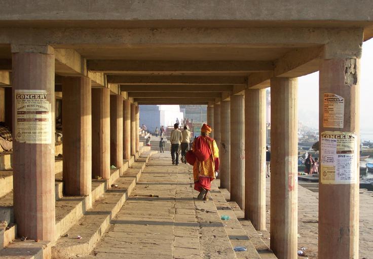 Keywords: walking robes red pillars man men sidewalk varanasi india holy