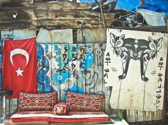 Keywords: wall decorated sitting place sofa couch comfortable outdoors turkish flag provisional