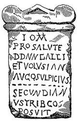 | Keywords: woodcut cumbria bowness inscription blackandwhite monochrome black and white Woodcut of a red sandstone altar built into a barn at Bowness House Farm (RIB 2057), Bowness-on-Solway. The inscription reads I(ovi) O(ptimo) M(aximo) / pro salute d(ominorum) n(ostrorum) Galli / et Volusiani / Aug(ustorum) Sulpicius / Secundian / us trib(unus) coh(ortis) / [p]osuit: 'For Jupiter Best and Greatest, for the welfare of our Lords Gallus and Volusianus, emperors, cohort tribune Sulpicius Secundianus set this up.' The joint emperors (father and son) date this to between AD 251 and 253. Scanned from the 1921 8th edition of the Handbook to the Roman Wall. Handbook pp.367–8 Woodcut of a red sandstone altar built into a barn at Bowness House Farm (RIB 2057), Bowness-on-Solway. The inscription reads I(ovi) O(ptimo) M(aximo) / pro salute d(ominorum) n(ostrorum) Galli / et Volusiani / Aug(ustorum) Sulpicius / Secundian / us trib(unus) coh(ortis) / [p]osuit: 'For Jupiter Best and Greatest, for the welfare of our Lords Gallus and Volusianus, emperors, cohort tribune Sulpicius Secundianus set this up.' The joint emperors (father and son) date this to between AD 251 and 253. Scanned from the 1921 8th edition of the Handbook to the Roman Wall. Handbook pp.367–8 |