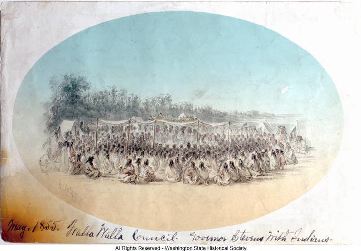 | Keywords: Walla Walla Council.jpg en A scene at the Walla Walla Treaty Council Isaac Stevens is standing under a canvas shelter at the center with other Euro-Americans around him Several Indians are standing under the shelter and some of them appear to be signing the treaty Many other Indians are seated on the ground around the shelter Washington State Historical Society Gustav Sohon 1855 PD-USGov Walla Walla Nez Perce Lithographs of Native Americans | ||||