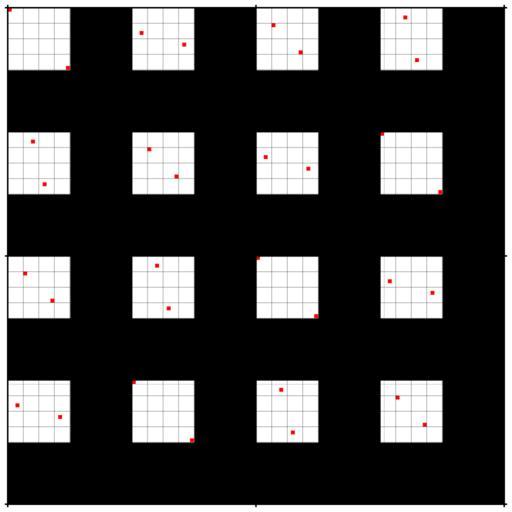 Keywords: Walsh permutation 1 2 7 8 25 42 127.svg Permutation matrix of the Walsh permutation wp 1 2 7 8 25 42 127 1 2 7 8 25 42 127 is <big> </big> A001317 1 7 -1<big> </big>/2 The elements of this permutation are the even elements of wp 1 3 5 15 17 51 85 255 divided by 2 It is self-inverse so the matrix is symmetric Above that the matrix is also symmetric to the antidiagonal bin2svg own mate2code Permutation matrices of Walsh permutations