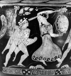 | Keywords: Walters-Dresden Painter - Bell-Krater with Satyrs and Maenads and Three Draped Men - Walters 4875 - Side A Detail.jpg This red-figure bell-krater depicts satyrs and maenads revelling on the front On the left a satyr wearing a fawn skin for a cloak and a wreath stands to the right; in his right hand he holds up a thyrsos from which an ivy vine hangs In front of him a maenad dances right looking around She wears a peplos girded at the waist bracelets earring wreath and possibly a necklace Over her head she holds a thyrsos in her right hand and in her left is a tympanum Next comes a satyr who goes right looking around He also wears a fawn skin for a cloak and a wreath His right arm is extended back over his head and in his left hand he holds a thyrsos On the right another maenad dances right looking around She wears a peplos diadem earring necklace bracelets and wreath and holds a ribbon between her hands Rocks and foliage fill out the scene On the back are three mantled youths two to the right and the third to the left The first holds a circular object possibly a aryballos in his extended right hand The one in the center gestures withhis right hand The third holds an aryballos by a string in his extended right hand A strigil hangs by his head The last two wear fillets Revelling satyrs and maenads is a popular subject at this time and similarly posed dancing figures are common ca 390 380 BC late Classical terracotta with handles cm 33 6 34 7 h x diam ; at mouth cm 34 2 diam ; at foot cm 17 1 diam accession number 48 75 30808 Don Marcello Massarenti Collection Rome cat no 195 Henry Walters city Baltimore Walters Art Museum Henry Walters Acquired by Henry Walters with the Massarenti Collection 1902 place of origin Attica Greece Walters Art Museum license Ancient Greek red-figure pottery in the Walters Art Museum Media contributed by the Walters Art Museum needs category review Walters-Dresden Painter Media contributed by the Walters Art Museum needs artist update Satyrs in ancient Greek pottery Dancing maenads in ancient Greek pottery |