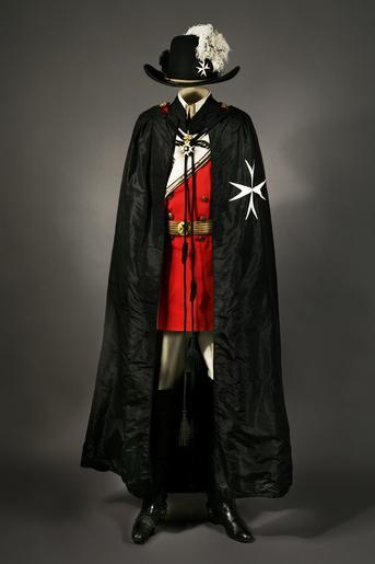| Keywords: Walther von Hallwyls ordensdräkt som Rechtsritter i Johanniterorden bestående av flera delar - Hallwylska museet - 85849.tif JOHANNITERORDENSDRÄKTER <br/><br/>Bestående av delar av ordensdräkt för Ehrenritter samt ordensdräkt för Rechtsritter Delar av ordensdräkt för Ehrenritter Bestående av hatt epåletter med fodral värja med balja samt ett par sporrar <br/><br/>Hatt Av svart silkesfelb på styv stomme Trekantig vitplymascherad Agraff av guldbuljoner bestående av två spirallindade kantiljer lagda med krus den ena av förgylld rund metalltråd massiv den andra av oförgylld platt dylik tråd guldlan samt med en förgylld knapp med ordenskorset i silver Foder av vitt siden merveilleux Mått Vidd 56 cm Brätte längd 10 5 cm Epåletter axelstycken ett par med fodral Av metall i form av en oval skiva med rektangulär platt flik med fasade hörn Skivans sidor med stoppning Epålettens översida överklädd med guldtyg undersidan med röd ylleflanell På flikens översida en förgylld knapp med ordenskorset i vit emalj avnött på undersidan en mycket lång hake av mässing Axelholk av papp insidan överklädd med höggul sammet; på utsidan tätt vertikalt liggande guldbuljoner hårt dubbeltvinnade kantiljer Mått Längd 16 cm ; höjd 8 cm Fodral Av papp med trycklock samt på utsidan klätt med mörkt blågrönt knottrigt papper 8-formigt Locket fodrat med ljust blågrönt moirépapper lockets och fodralets kanter med likafärgat slätt papper Fodralets botten och sidor inuti vadderade samt fodrade med ljusgult fyrskaftat bomullstyg Under botten mörkblått papper Mått Höjd 10 cm ; längd 32 cm ; bredd 19 cm Värja med balja Klinga av stål blankpolerad tveeggad jämnt avsmalnande mot udden med sexsidigt tvärsnitt plana sidor och spetsig udd På klingans övre del i blankt mot mattetsad botten på vardera sidan akantusbladorneringar i tre grupper den övre och den nedre med en trofégrupp dessutom på mellersta gruppen på insidan preussiska örnen jämte ett i S-form gående skriftband varpå MIT GOTT F KÖNIG U VATERLAND Fäste av förgylld mässing Parerplåt hjärtformig skålig med bred ytterkant samt med den spetsiga ändan uppsvängd Mellan klingan och parerplåten två röda yllelappar Handbygel bågformig med ovalt tvärsnitt samt med nedre änden fortsättande på den bygeln motsatta sidan i en kort parerstång med tvär ytterände och avsmalnande inåt Kavel av trä spolformig med ovalt tvärsnitt samt lindad med höger- och vänstertvinnad grövre och finare tråd av silver Knapp långsträckt päronformig med övre ändan avslutad i en platt ändknapp på insvängd hög hals; på knappens utsida fritt pålagt i silver ordenskorset Mått Längd 0 95 m Klinga bredd vid fästet 1 5 cm Fäste längd 13 9 cm Balja Av svartlackerat läder med munbleck och släpsko av förgylld mässing Längs baksidan en grov spannad söm Munbleck och släpsko släta det förstnämnda med snett utvikt mynningskant samt på framsidan en nedåtriktad lång hake avsmalnande nedåt Mått Längd 0 81 m ; bredd 2 2 cm Munbleck längd 9 2 cm Släpsko längd 11 5 cm Sporrar spännsporrar ett par Av förgylld mässing Bygeln klackbågen med något uppsvängda skänklar trefasad utsida och platt insida samt avsmalnande utåt på vardera ändan en kullrig knapp på rakt utstående lång rundstavig hals Remmar saknas Mått Längd 12 5 cm ; bredd 10 9 cm Ordensdräkt för Rechtsritter Bestående av hatt mantel vapenrock livrem med gehäng värja med balja ordensband byxor stövlar sporrar med vristskydd block samt koffert med nycklar och överdrag Hatt Av svart styv filt med på sidorna uppviket brätte kantat med ett svart sidenmoiréband samt uppåt avsmalnande platt hög kulle nedtill denna en tjock snodd av förgylld metalltråd baktill med två öglor samt två tofsar av guldbuljoner tofshuvudet horisontalt lindat med dylika buljoner Framtill en vit och en svart lång strutsplym liggande över kullen och fäst under en kokard av hoprynkat svart sidenmoiréband varpå ordenskorset av vitt linnetyg Foder av vitt siden merveilleux ; svettrem av ljust beigefärgat getskinn baktill med en rosett av silkestrikåband i samma färg Mått Vidd 57 cm Kulle höjd 14 5 cm Brätte bredd 10 5 cm Mantel Av svart siden taft Hand- och maskinsydd Rektangulär i tre raka våder Övre kortsidan med fyra täta rynkrader utom på ett stycke vid vardera framkanten Foder av tunnare svart siden taft isytt med snoddade ytterkanter Halslinning smal dubbelviken Mått Längd 150 cm ; halsvidd 50 cm Vapenrock Av scharlakansrött kläde med knappar av förgylld koppar Livskuren tvåradig med tre par knappar Framstyckenas kanter passpoaler av vitt kläde Axelklaffar flätade av galonband i guld och med ordenskorset samt fodrade med rött kläde Krage rockslag ärmuppslag jämte skörtklaffar av vitt kläde Krage hög dubbelviken rockslag stora tresidiga ärmuppslag höga skörtklaffar konturerade de senare vardera med tre knappar jämte en smal guldgalon de övriga med en bred och en smal dylik Knappar runda kupiga med ordenskorset i relief baksidan av vit metall med en rundstavig ögla På vänstra framstycket en kort horisontal uppslitsning med fällklaff för värjan därovanför fyra horisontala silkesstränsar ordensfästen Foder av vitt siden i detsamma under vardera bakskörtet en ficka Mått Ärmhålsdjup 23 cm ; livlängd 42 cm ; längd hel 76 cm ; ryggbredd halv 18 cm ; ärmlängd 78 cm ; bröstvidd fram 44 cm ; bröstvidd hel 100 cm ; livvidd 90 cm Livrem med spänne och värjgehäng Remmen av grovt läder på utsidan ett pålagt band vävt av fina guldtrådar bildande fem längdgående flacka stavar omväxlande med smala ränder i hålmönster; insidan fodrad med rött kläde; remmens ena ände trubbvinklig på denna en fyrsidig sölja av mässing fastsydd med en kort läderflik samt avsedd för en på livremmens insida befintlig smal rem med mörkröd utsida och nio spännhål samt med innerändan