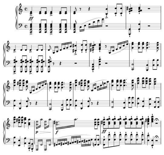 Keywords: WandererFantasie-Schubert-Introduction.svg Introduction to Franz Schubert's piano fantasia D 760 File generated from the SVG output of Lilypond using the following file <pre> \header title Wanderer Fantasie D 760 subtitle Introduction source IMSLP00886 Leipzig Breitkopf Härtel 1884-1897 Plate F S 108 composer Franz Schubert 1797-1828 copyright Public Domain \version 2 10 \score \new PianoStaff << \new Staff \clef treble <c' e'>4\ff-> <c' e'>8 <c' e'>8 <c' e'>4-> <c' e'>8 <c' e'>8 <c' e'>8 r8 r4 <b b'>4- -> <c' c>8- <c' c>8- <f' g' b' cis>4- <f' g' b' d>4- r2 \break d'4-> d'8 d'8 d'4-> d'8 d'8 d'8 g16 b16 d'16 f'16 g'16 b'16 <cis' cis>4- -> <d' d>8- <d' d>8- <dis' g' c dis>4- <e' g' c e>4- r8 g16 c'16 e'16 g'16 c16 e16 <g' e g>4 <g' e g>8 <g' e g>8 <g' d g>4 <g' d g>8 <c g c>4 <c fis c>8 <c fis c>8 <b' g b>8 g16 c'16 e'16 g'16 c16 e16 <g' e g>4 <g' e g>8 <g' e g>8 <g' d g>4 <g' d g>8 <c g c>4 <c fis c>8 <c fis c>8 <b' g b>8 c'16 f'16 a'16 c f a <c a c>4 <c a c>8 <c a c>8 <c g c>4 <c g c>8 <f c f>4 <f b f>8 <f b f>8 <e b e>4 <e a e>4 <d a d>4 <d gis d>8 <d gis d>8 <c a c>4 <a' c a>4 \repeat tremolo 4 <a' e>16\p\> a16 \repeat tremolo 4 <a' e>16 a16\ \repeat tremolo 4 <a' dis>16 \f a16 <a' dis a>8 <a' dis a>8 <a' dis a>8- \ff <b' dis a b>8- <b' dis a b>8- <b' dis a b>8- <b' dis a b>8- <b' dis a b>8- <b' dis a b>8- <b' dis a b>8- <b' e gis b>4- <e gis b e>4- r2\fermata \new Staff \clef bass <c g c e g>4-> <c g c e g>8 <c g c e g>8 <c g c e g>4-> <c g c e g>8 <c g c e g>8 <c g c e g>8 c16 e g c' e' g' r2 <g g >4- <g g>4- r2 \break <g g f g b>4-> <g g f g b>8 <g g f g b>8 <g g f g b>4-> <g g f g b>8 <g g f g b>8 <g g f g b>8 r8 r4 r2 <c g c>4- <c g c'>4- r2 <c c>2 <b b >4 <b b>8 <b b>8 <a a>4 <d d>4 <g g>8 r8 r4 <c c>2 <b b >4 <b b>8 <b b>8 <a a>4 <d d>4 <g g>8 r8 r4 <f f>2 <e e>4 <e e'>8 <e e'>8 <d d'>4 <g g>4 <c c'>4 <f f>8 <f f>8 <b b>4 <e e>4 <a a>4 <a a >8- <g g >8- \repeat tremolo 4 f 16 f 16 \repeat tremolo 4 f 16 f 16 fis 16 g 16 gis 16 a 16 ais 16 b 16 c16 cis16 d16 dis16 e16 f16 <f f>8 <f f>8 <f f>8- <f f'>8- <f f'>8- <f f'>8- <f f'>8- <f f'>8- <f f'>8- <f f'>8- <e e'>4- <e e>4- r2\fermata >> \midi \context \Score tempoWholesPerMinute ly make-moment 144 4 </pre> Rework with Inkscape removed text and converted all objects to paths updated some items then saved as simple SVG en Franz Schubert's piano fantasia D 760 introduction fr Introduction de la fantaisie pour piano D 760 de Franz Schubert Own Romainbehar 2008-10-06 GNU LilyPond images Der Wanderer Images with LilyPond source code Sheet music for piano |
