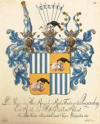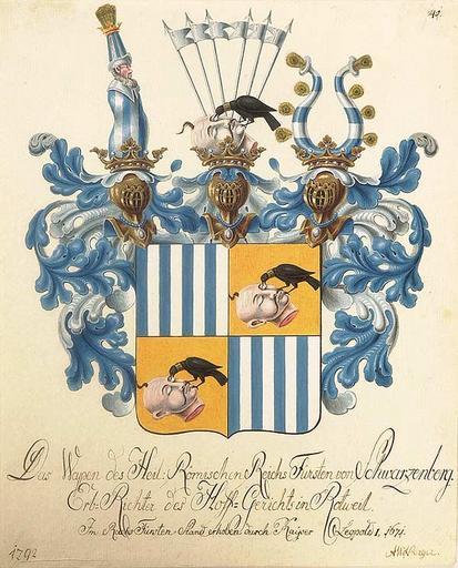 Keywords: Wappen der Fürsten von Schwarzenberg 1792.jpg žDas Wappen der Heil Römischen Reichs Fürsten von Schwarzenberg Erb-Richter des Hoff-Gerichts in Rottweil im Reichs-Fürsten-Stand erhoben durch Kaiser Leopold 1671 datiert 1792 Temperazeichnung 24 x 19 cm http //www auktion-wendl de/ 1792 anonymous PD-old-100 Nobility of the Holy Roman Empire Karl Philipp Prince of Schwarzenberg Coats of arms of the House of Schwarzenberg Crows and Ravens in heraldry Crows and Ravens in crest Quarterly shields Oseledets Cossacks in heraldry Turkishes in heraldry |