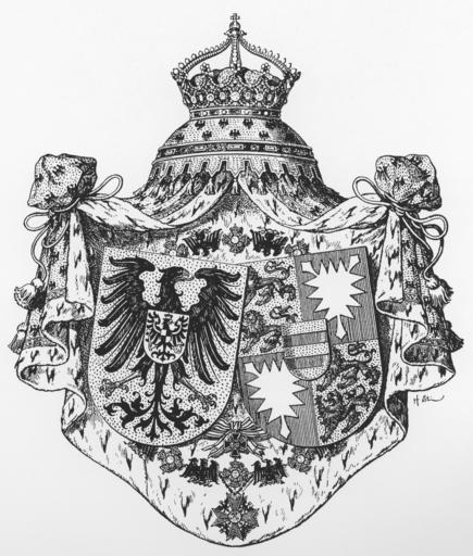 Keywords: Wappen Deutsches Reich - Alliance-Wappen der Kaiserin Auguste Victoria.png blazon of de Alliance-Wappen Ihrer Majestät der Kaiserin Auguste Victoria en Her Majesty the German Empress Auguste Victoria de Das Alliance- Wappen Ihrer Majestät der Deutschen Kaiserin Auguste Victoria geb Prinzessin zu Schleswig-Holstein Sonderburg-Augustenburg Die zwei zu einander geneigten Schilde enthalten die Figuren des kaiserlichen und des Geschlechtswappens der hohen Frau Der Kopf des kaiserlichen und preussischen Adlers ist entsprechend der Wappencourtoisie dem Wappen von Schleswig-Holstein zugekehrt Das Geschlechtswappen geviert und mit einem Herzschilde belegt zeigt im Herzschilde das Wappen der alten Grafschaft Oldenburg in Gold zwei rote Querbalken; im ersten und vierten Felde das Wappen des Herzogtums Schleswig in Gold zwei übereinander laufende blaue Löwen; im zweiten und dritten Felde das Wappen des Herzogtums Holstein in Rot ein gezahnter silberner Schildbeschlag Hinter die beiden Schilde gelegt erscheint die Kette des Hohen Ordens vom schwarzen Adler und der Luisen-Orden an einem weissen schwarz geränderten Bande dessen Schleife zwischen den beiden Schilden sichtbar wird Das Kleinod des Luisen-Ordens von König Friedrich Wilhelm III am 3 August 1814 gestiftet besteht in einem schwarzen goldgeränderten Kreuze dessen blaues Medaillon den von sieben silbernen Sternen umgebenen goldenen Buchstaben L zeigt Das Ganze ist unter einem goldenen mit schwarzen rot bewehrten Adlern gemusterten mit Hermelin gefütterten und ausgeschlagenen Wappenzelte angebracht Die Kuppel von einem purpurroten mit Edelsteinen besetzten Reif umschlossen trägt die Krone der Kaiserin die mit Brillanten und Rubinen reich geziert vier mit Perlen besetzte Bügel trägt die oben mit dem Reichsapfel abschliessen Hinter den zwölf Kronenzacken wird eine ornamental gemusterte Mütze aus Goldbrokat sichtbar die mit Goldstoff gefüttert ist Die Farben der Kaiserin sind Blau-Gelb-Rot-Weiss 1897 Creator Hugo Gerhard Ströhl Ströhl Hugo Gerard Deutsche Wappenrolle Enthaltend alle Wappen Standarten Flaggen Landesfarben und Kokarden des Deutschen Reiches seiner Bundesstaaten und regierenden Dynastien Nach offiziellen Angaben gezeichnet und erläutert Stuttgart 1897 Fig 3 PD-old-auto 1919 PD-Coa-Germany other versions Coats of arms of the German Empire Arms of alliance royal and ducal mantling Marshalled Oldenburg Order of the Red Eagle in heraldry Order of the Black Eagle in heraldry Deutsche Wappenrolle |