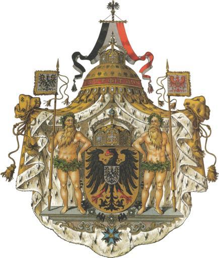 Keywords: Wappen Deutsches Reich - Reichswappen (Grosses).png blazon of de Seiner Majestät des Deutschen Kaisers Größeres German Emperor Greater Empereur allemand Grandes armes preussischen Wappenschild dessen Adler mit dem Schilde von Hohenzollern belegt ist im goldenen Schilde der über sich die deutsche Reichskrone trägt Um den Schild schlingt sich die Kette des Hohen Ordens vom Schwarzen Adler Der Schild der auf einem steinernen Postamente aufruht wird von zwei mit Eichenlaub bekränzten und umgürteten wilden Männern als Schildhalter beseitet von denen jeder eine goldbefranste und mit goldenen Schnüren gezierte nach außen abfliegende Standarte an goldener Lanze trägt Die Standarte des rechts stehenden Schildhalters zeigt die Wappenfigur des Schildes mit welcher die Herzstelle des Reichsadlers belegt ist den Adlerkopf zur Stange gewendet Die Standarte des linken Schildhalters trägt das Wappenbild des Markgraftums Brandenburg dessen Adler mit dem Schilde des Burggraftums Nürnberg belegt ist <br/> Ueber dem Wappen erhebt sich das kuppelförmige mit Hermelin ausgeschlagene und gefütterte mit goldenen Schnüren aufgebundene Kaiserzelt aus Goldbrokat mit schwarzen rotbewehrten Adlern und goldenen Reichskronen abwechselnd gemustert Ein purpurroter Reif von dem goldbequastete mit weissen Tafelsteinen belegte Goldlätze herabfallen umschliesst die Kuppel und trägt in goldenen Lettern die preussische Devise «GOTT MIT UNS» <br/> Auf dem Gipfel des Zeltes ruht die Reichskrone über die das Nationalbanner hervorragt Es hängt an einer goldenen Querstange mit Kronenenden werlche Stange wieder an einem in den preussischen Farben Schwarz - Silber gestreifen Maste befestigt ist der auf seinem Kronenende den preussischen Adler trägt Die Farben des in der Mitte geschlitzten und in Quasten endigenden Nationalbanners sind Schwarz-Silber-Rot 1897 Creator Hugo Gerhard Ströhl Lithography Creator Adam Gatternicht Ströhl Hugo Gerard Deutsche Wappenrolle Enthaltend alle Wappen Standarten Flaggen Landesfarben und Kokarden des Deutschen Reiches seiner Bundesstaaten und regierenden Dynastien Nach offiziellen Angaben gezeichnet und erläutert Stuttgart 1897 Tafel I PD-old-auto 1919 PD-Coa-Germany other versions Greater imperial coat of arms of Germany svg Wappen Deutsches Reich - Reichswappen Grosses svg DEFAULTSORT Germanempire Coats of arms of the German Empire Greater Adam Gatternicht - Coats of arms Nettle leaves in heraldry Wild man in supporters Coats of arms of the house of Hohenzollern Royal and ducal mantling Order of the Black Eagle in heraldry Deutsche Wappenrolle Gott Mit Uns ImageNote 1 641 598 459 72 1700 2000 2 žGott mit Uns - Prussian Motto in Unziale Font ImageNoteEnd 1 ImageNote 2 659 1137 420 518 1700 2000 2 Single headed imperial eagle in a round shield or ImageNoteEnd 2 ImageNote 3 832 4 86 156 1700 2000 2 Crowned Prussian Eagle with FR-Monogram on the breast standing with his claws on a crowned black-white Flagpole ImageNoteEnd 3 ImageNote 4 811 1289 115 141 1700 2000 2 Prussian Eagle with Prussian Sceptre and Orb Hohenzollern Shield on the Breast ImageNoteEnd 4 ImageNote 5 1297 574 166 148 1700 2000 2 Brandenburgian Eagle with Electoral Hat Old Imperial Sceptre and Sword Breastshield of the Burgraviate of Nuremberg ImageNoteEnd 5 ImageNote 6 291 564 156 148 1700 2000 2 Prussian Eagle facing opposite direction with Scetpre Orb and Hohenzollern Shield on Breast ImageNoteEnd 6 ImageNote 7 1077 869 301 785 1700 2000 2 Wild Man Supporter ImageNoteEnd 7 ImageNote 8 660 813 414 330 1700 2000 2 Imperial Crown Design of 1889 ImageNoteEnd 8 ImageNote 9 660 1652 418 256 1700 2000 2 Collar of the Order of the Black Eagle ImageNoteEnd 9 ImageNote 10 567 154 619 436 1700 2000 2 Flag of the German Empire 1871-1918 ImageNoteEnd 10 ImageNote 11 365 855 301 799 1700 2000 2 Wild Man Supporter ImageNoteEnd 11 |