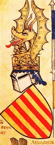 Keywords: Wappen Rex Aragon Gelre Folio 62r.jpg Page out of the Armorial Gelre Folio 62r de l'Armorial de Gelre Detail Coats of arms of kings of Aragon Hungarian Wikipedia http //hu wikipedia org/wiki/Gelre Creator Claes Heynenzoon This image depicts a seal an emblem a coat of arms or a crest PD-old-100 Claes Heynenzoon Gelre Armorial Coats of arms of kings of Aragon Coats of arms of Peter IV of Aragon Coats of arms of the crown of Aragon Casal d'Aragó Dragons in crest Pales of Aragon in heraldry |