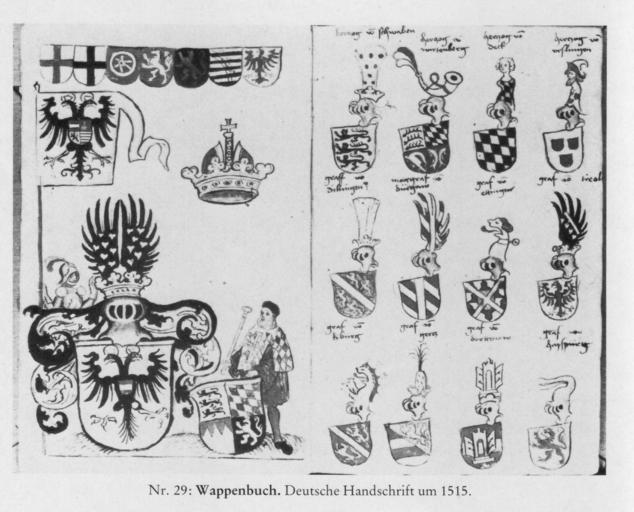 Keywords: Wappenbuch hupp ca1515.jpg de Seite aus verschollenem Wappenbuch ehemals Privatbesitz Otto Hupp Hartung Karl München Aukt 52 1986 Katalog Nr 29 mit Abb Tf 2 File Wappenbuch hupp beschreibung jpg ~ 1515 http //commons wikimedia org/wiki/File Wappenbuch_Hupp_Herold jpg PD-Art Georg Rüxner Coats of arms of Bohemia Cologne See coats of arms Mainz See coat of arms Coats of arms of Oettingen family Trier See coat of arms ImageNote 1 328 106 92 108 1512 1222 2 en Coat of arms of Bohemia ImageNoteEnd 1 ImageNote 2 1096 418 153 356 1512 1222 2 en Coat of arms of Oettingen family ImageNoteEnd 2 |