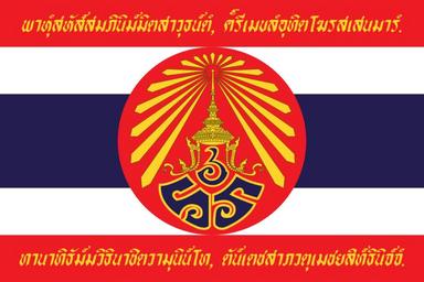 | Keywords: War flag of Thailand (World War I-Reverse).svg Cleanup image Needs better font See https //i ytimg com/vi/CIakhxHLgL4/hqdefault jpg this picture of the original flag for example <poem> พาหุํสหัส์สมภินิม์มิตสาวุธน์ตํ ค๎รี มขลํอุทิตโฆรส สนมารํ ทานาทิธัม์มวิธินาชิตวามุนิน์โท ตัน์ ตชสาภวตุ มชยสิทธินิจ์จํ </poem> <poem> Bāhuṃ sahassam-abhinimmita sāvudhan taṃ grīmekhalaṃ uditaghora sasenamāraṃ Dānādadhammavidhinā jitavā munindo tan tejasā bhavatu me jayasiddhiniccaṃ </poem> The entire poem can be read on Thai Wikisource พุทธชัยมงคลคาถา modern orthography Thanks for original image from http //www tv5 co th/service/mod/heritage/nation/military/flag/index2 htm Thai Heritage Museum and Xiengyod's Site http //www bloggang com/data/xiengyod/picture/1187382211 jpg http //www bloggang com/data/xiengyod/picture/1187382088 jpg พระบาทสม ด็จพระรามาธิบดีศรีสิรินทร มหาวชิราวุธฯ พระมงกุฎ กล้า จ้าอยู่หัว พระราชทานแก่ทหารไทยที่ไปปฏิบัติราชการสงครามในสงครามโลกครั้งที่ ๑ ณ ทวีปยุโรป ภาพธงนี้ ดิมกำหนดให้ ป็นด้านหน้า แต่ มื่อติดกับด้ามธงแล้ว ด้ามธงอยู่ด้านขวาของ ืนธงด้านนี้ ดังนั้น ภาพธงนี้จึง ป็นธงด้านหลังตามหลักสากลนิยม <br /> ลักษณะของธงด้านนี้ ป็นธงขนาดอัตราส่วน ๒ ต่อ ๓ แบบธงไตรรงค์ ตรงกลาง ืนธงมีวงกลมสีแดงกว้างจรดขอบสีแดงด้านนอกของธงไตรรงค์ ภายในมีอักษรพระปรมาภิไธยย่อ ร ร และ ลข ๖ หมายถึง รามวชิราวุธที่ ๖ อยู่ภายใต้พระมหาพิชัยมงกุฎ ปล่งรัศมีสี หลือง ขอบสีแดงด้านนอกของ ืนธง จารึกบทย่อของชัยมงคลคาถา พาหุงสหสฺสมภินิมฺมิตสาวุธนฺตํ ครี มขลํอุทิตโฆรส สนมารํ ทานาทิธมฺมวิธินาชิตวามุนินโท ตนฺ ตชสาภวตุ มชยสิทธินิจจํ ปัจจุบันธงนี้ ลิกใช้แล้ว 40px40px40px40px40px Own Tangmo 2007-03-23 insignia <gallery> File War flag of Thailand World War I-Obverse svg Obverse side of the flag </gallery> War flags Thailand Colours of the Siamese Expeditionary Force in World War I SVG flags - military of Thailand SVG flags - historical of Thailand Pali language Royal monograms of King Rama VI |